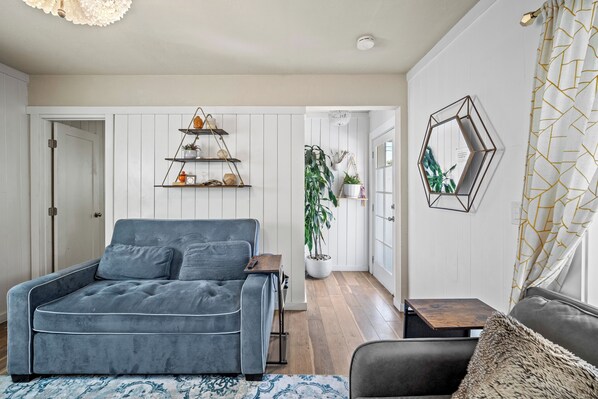 After a day of beach time or sightseeing, relax in the private, fenced backyard—gather around the fire pit in the evening or fire up the grill and enjoy your meal with a bottle of local California wine. Inside, the home offers two comfortable queen beds, a sofa bed, a fully stocked bathroom with a hairdryer, and modern amenities including high-speed Wi-Fi and air conditioning to ensure a relaxing and comfortable stay.