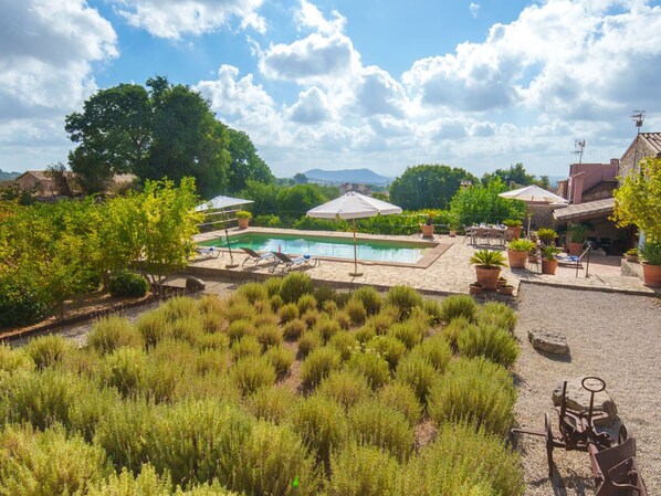 Beautiful, historical house "Sa Rota", from the 19th century. 200 m from the centre of Biniamar, on the outskirts, 5 km from the centre of Inca, 31 km from the centre of Alcudia, in an elevated position, 30 km from the sea. Private: property 2'500 m2 (fenced), beautiful terraced garden with wildlife garden and trees, orchard, swimming pool (9 x 5 m, seasonal availability: 01.Jan. - 31.Dec.) with salt-electrolysis pool-cleaning system. Outdoor shower. Stepped path (6 steps) to the house. Roofed, parking on the premises. Shop 4 km, bus stop "Biniamar" 300 m, sandy beach "Playa de Muro" 30 km. Please note: car recommended.