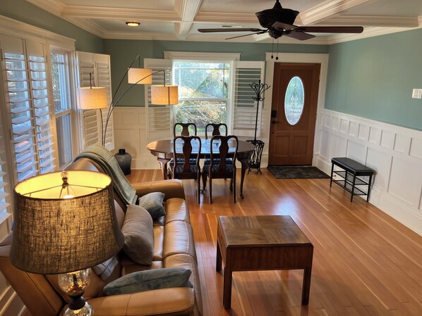 A spacious living room with original hardwood floors, zero-gravity reclining sofa, and a Smart TV