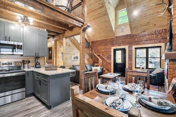 The fully equipped kitchen creates a warm and welcoming atmosphere for preparing meals. The dining area includes a custom-made reclaimed wood table and chairs, along with bar seating for three. A full-sized washer and dryer are also provided for guest convenience.