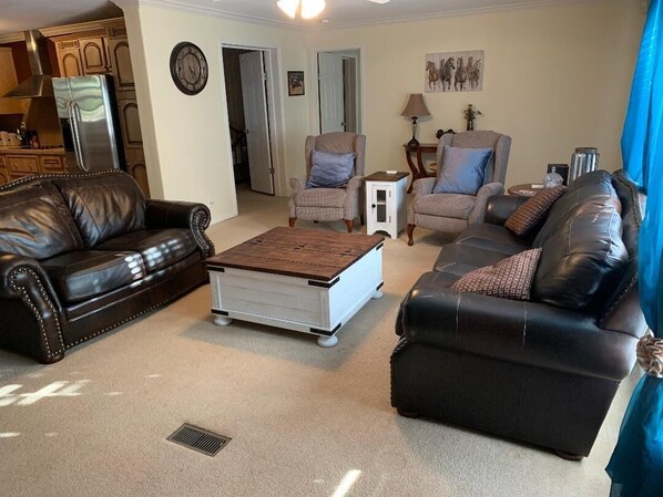 Rock Creek Retreat host three large bedrooms and an office that sleeps one, two full baths, a huge open kitchen fully equipped with everything you need to fix the best of meals. There is also a full size utility room with an extra refrigerator. Both the front and back doors are accompanied with handicap ramps and patios for easy access without steps. The large front patio is great for visiting, enjoying the outdoors and night sky views.