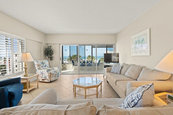 This beautifully appointed 2-bedroom, 2-bathroom condo features a spacious primary ensuite with a king-size bed, along with a guest bedroom offering two twin size beds. The unit includes a large living area, a dedicated dining space, and a fully equipped kitchen with all appliances and granite countertops. The condo also features three large flat-screen televisions and central heating and air conditioning for year-round comfort. Step onto the lanai to enjoy gorgeous views of the Gulf of Mexico with truly spectacular scenery with magnificent sunsets that are a sight to behold.