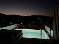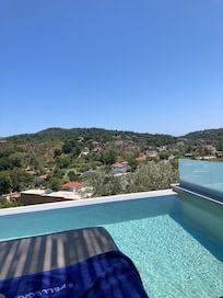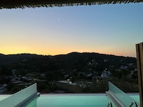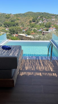 Suíte real, várias camas, piscina particular, vista parcial para o mar