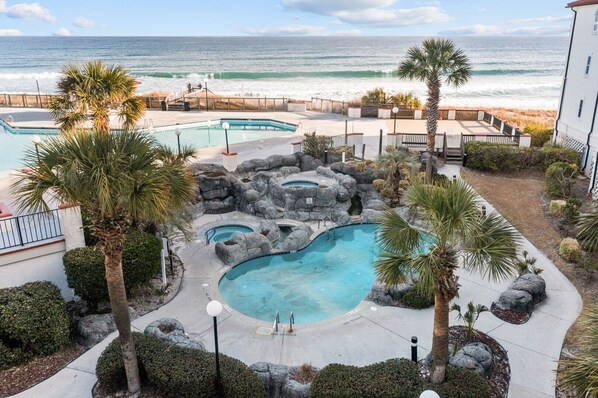 De frente para a praia, com banheiras de hidromassagem