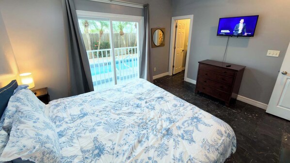 This ground-floor condo (no stairs!) is one of only four units in the building and offers shared access to a quiet / small backyard pool. Inside, you’ll find a clean, simple space with all-tile floors, high ceilings, an eat-in kitchen counter, and a cozy corner-bench dining area—great for family meals or game nights. This property does not have a dishwasher unfortunately The condo has 2 bedrooms and 2 full bathrooms. We allow up to 8 people including babies & toddlers, though the sleeping arrangements are best suited when some guests are children. The master bedroom features a king bed and private en suite bathroom.