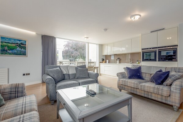 Welcome to a charming 3-bedroom apartment at the prestigious West Burn Lane development in the heart of St Andrews. This modern and stylish property offers a perfect blend of comfort and convenience, making it an ideal base for families or friends exploring the historic town. The apartment features an inviting open-plan living area, seamlessly integrating the living room, kitchen, and dining space. This expansive area is designed for both relaxation and entertainment, boasting large windows that flood the space with natural light. The living room is tastefully furnished with comfortable seating and a flat-screen TV, providing a cozy spot to unwind after a day of sightseeing or golfing.