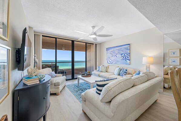 Open-concept living space with a picturesque Gulf Front Balcony, cozy seating & Smart TV 📺
