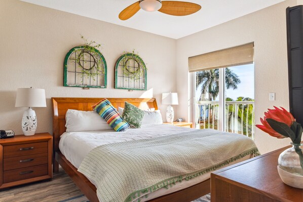 - Master En Suite has king bed, Smart TV, private balcony access, and extra vanity sink