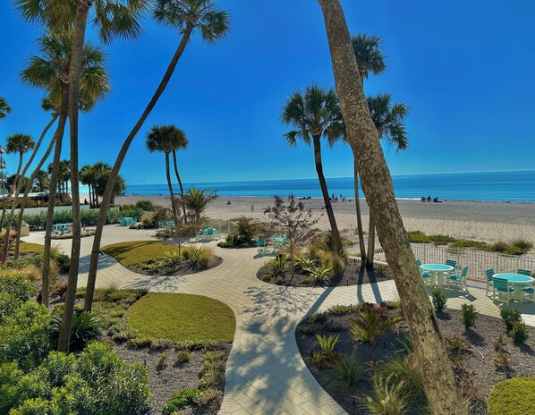 Wow! Direct Gulf front condo with new coastal decor. Open the front door and see the Gulf of Mexico right away, turn around and see the Intracoastal Waterway...water, water everywhere. This 3 bedroom, 2 bathroom condo will not disappoint. The living room has comfy seating with a ceiling fan and a large TV with a DVD player and amazing views of the beach. The sliding glass door opens to a private balcony for outdoor living and beautiful sunsets nightly! There is even a ceiling fan on the balcony for added comfort. The Gulf-front master bedroom also has sliding glass doors to the balcony. Wake up to the surf lapping the soft sugary sands of Indian Shores. The master bedroom has a King size bed with a ceiling fan, TV and ensuite bathroom. The ensuite master bathroom has an updated step-in shower. The second bedroom has 2 new (Nov 2019) Queen beds in 2nd bedroom with a ceiling fan, TV and view of the Intracoastal Waterway across the street. The 3rd bedroom has 2 Twin beds, ceiling fan, TV and views of the Intracoastal Waterway. There is a Washer/Dryer in the condo, no need to overpack.FREE secure WiFi in the condo and FREE long distance to U.S. and Canada. The property has lovely green space landscaped with native plants. The pool deck has new (2019) lounge chairs and a number of tables and chairs as well as FREE WiFi at the pool area. There is a large Heated Swimming Pool, Hot Tub, and both charcoal and gas grills. Recreation room with restrooms, a Ping Pong table and a lending book library. There is also a coin laundry available on the 2nd floor as an option. Non-Smoking. No Pets. Ask your rental manager about unlimited FREE DVD movies and FREE weekday bicycle use.