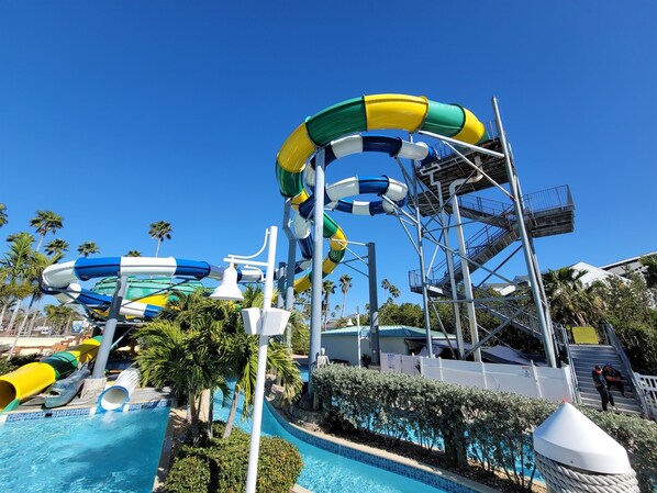 Walk to beautiful Indian Rocks Beach in 3 minutes or head downstairs to the all ages Splash Harbour Water Park with your 4 free passes ($100 value per day) that can be used every day of your stay. Additional passes are half price. Whether you want to zoom down the 2 water slides, relax on the lazy river, or grab some food and drinks at the Rum Shack, there will be plenty of activities for the whole family without ever leaving the condo.