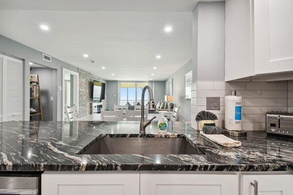 Kitchen – dazzling countertops and stone accents featuring stainless steel appliances and updated shaker cabinets. Stocked with cookware and bakeware, everything you need to make meals while away.