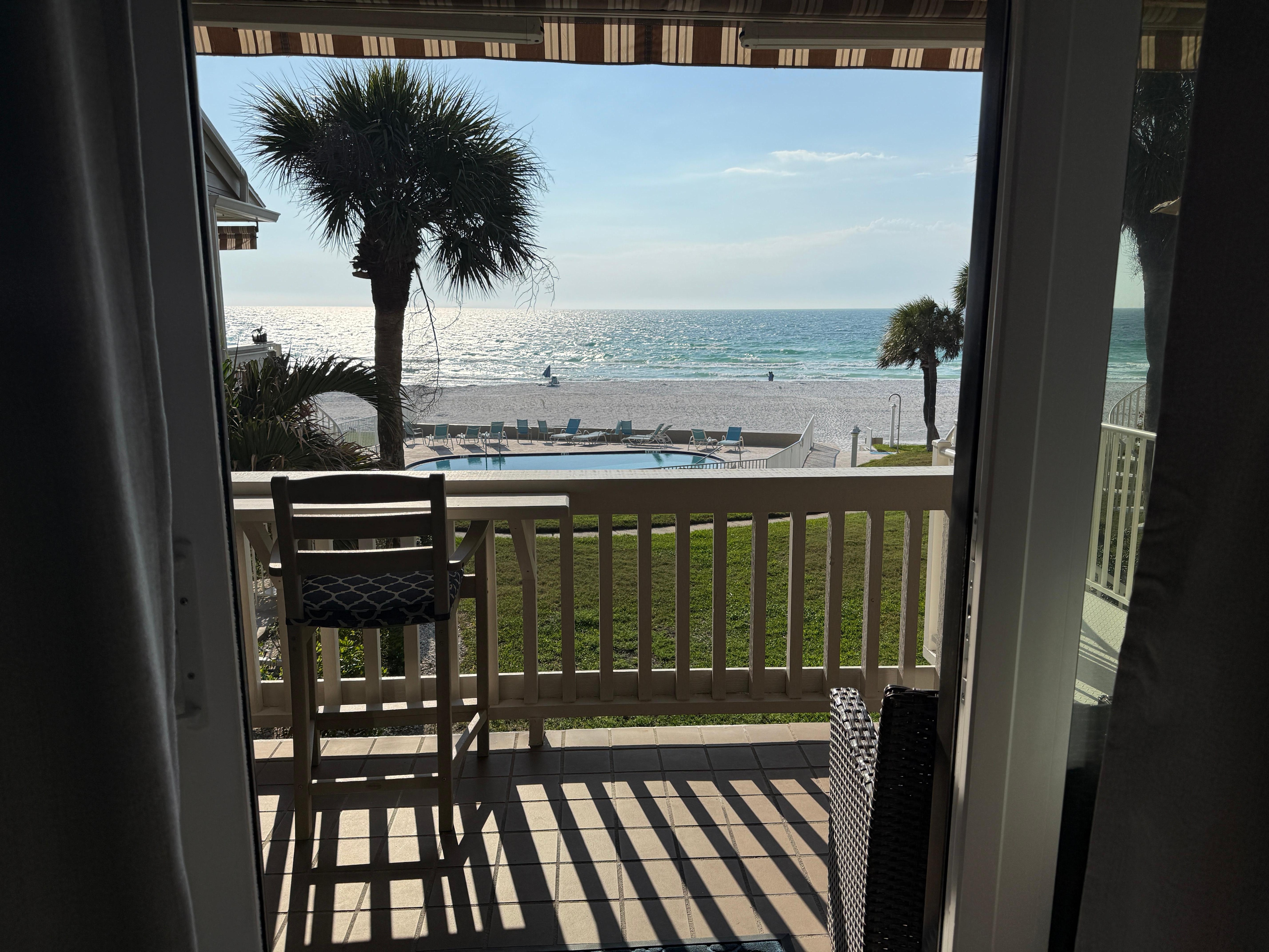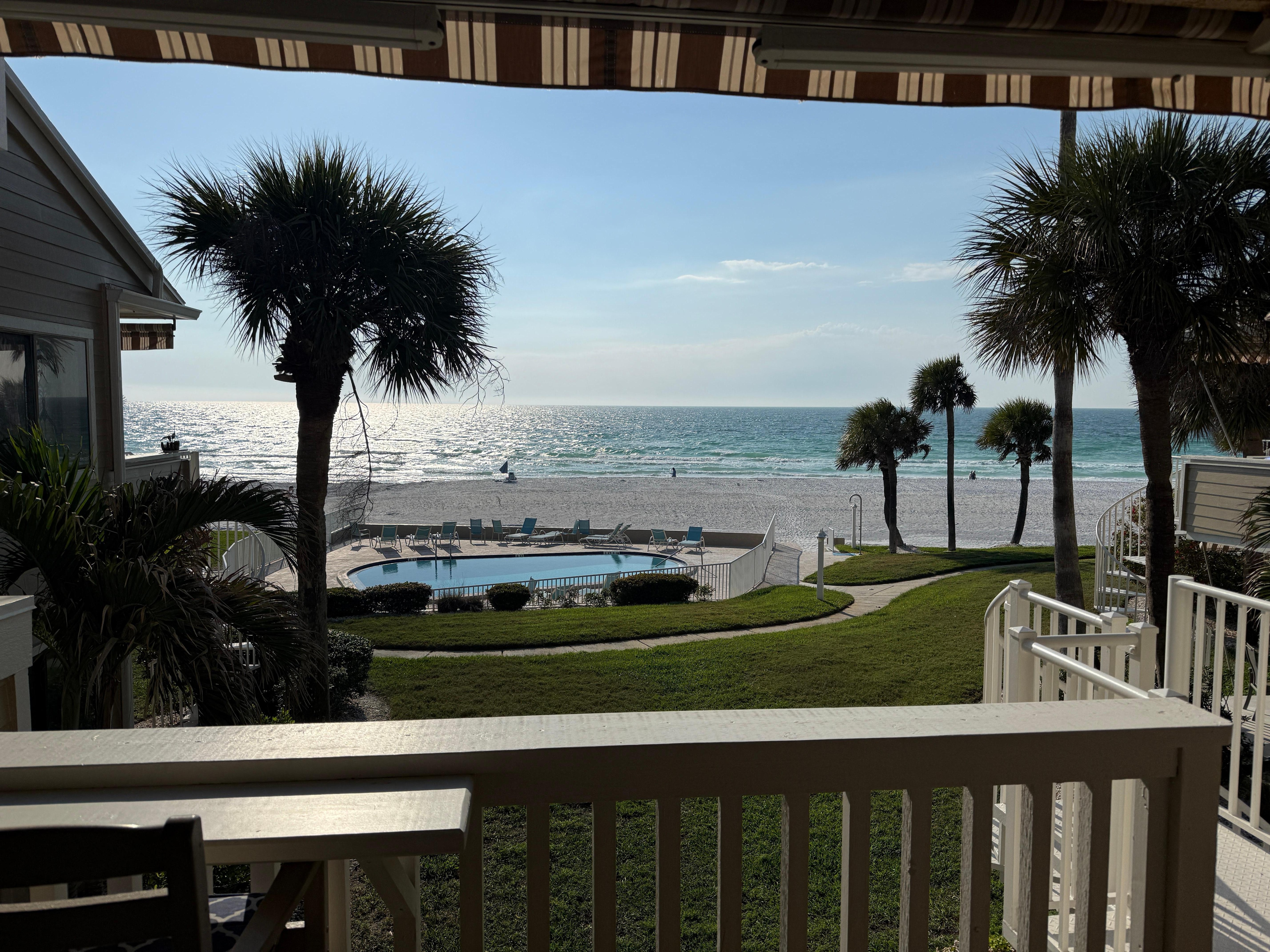 Living area features breathtaking views of the Gulf and access to the covered balcony where you can enjoy your morning coffee and take in the beautiful landscaped grounds this sits on. You can walk down the spiral staircase right to the pool and then onto view the beautiful coastline and take a walk on the beach. The patio lets you take it all in from sunrise to enjoying the beautiful sunsets in the most sought after area in the world. You'll think it's just you here to soak it all in.