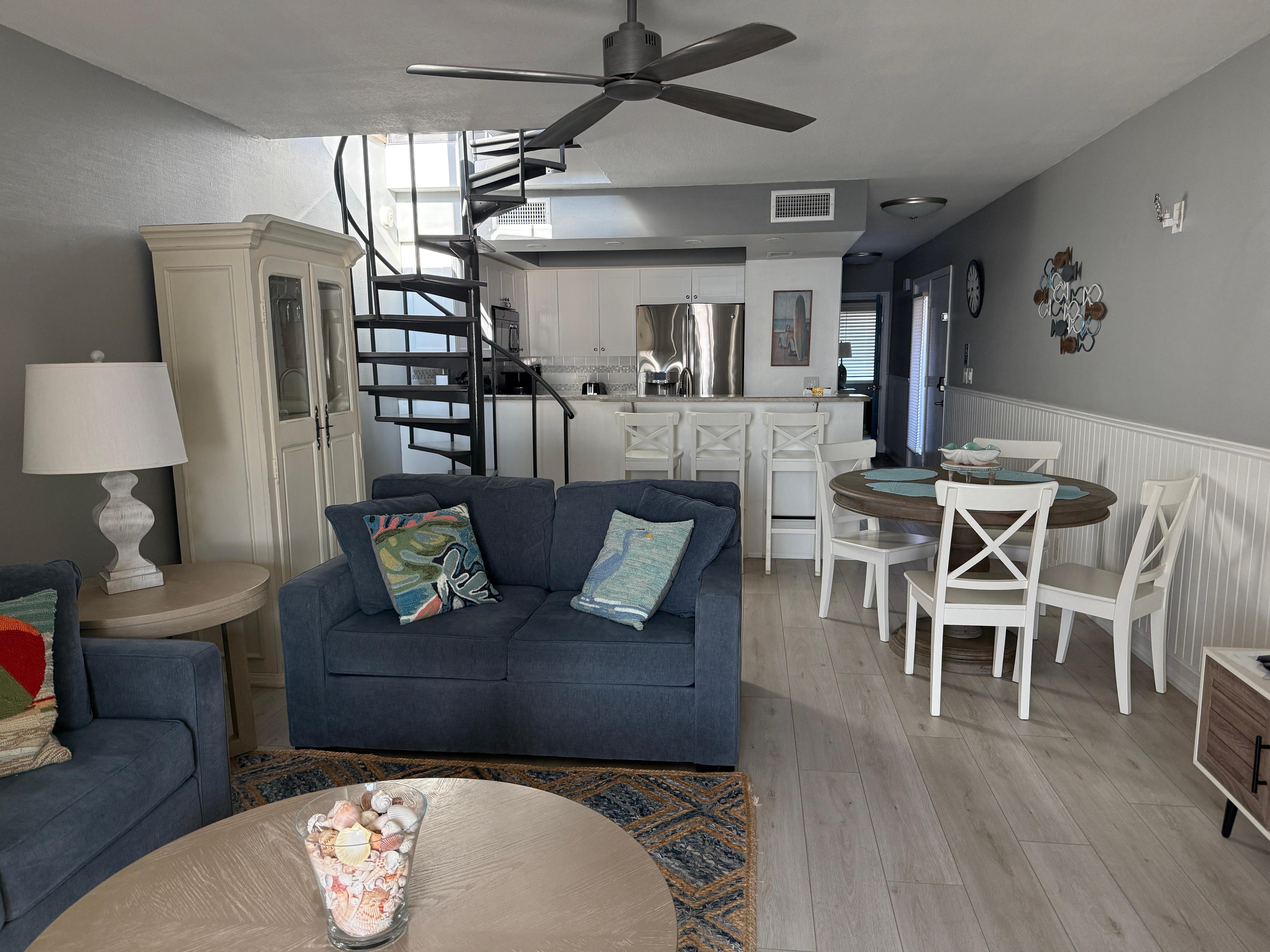 The spiral staircase leads you to the top floor where the Primary Suite awaits.