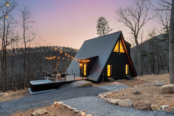 Twilight A-Frame is set on a stunning mountainside surrounded by peaceful woodland, creating a seamless connection between the home and its natural surroundings. Step outside to crisp mountain air, quiet forest sounds, and sweeping valley views. The centerpiece of the property is a striking modern A-frame, thoughtfully designed to balance rustic charm with contemporary comfort. Expansive windows flood the interior with natural light while framing breathtaking views, blurring the line between indoor living and the serene outdoors.
