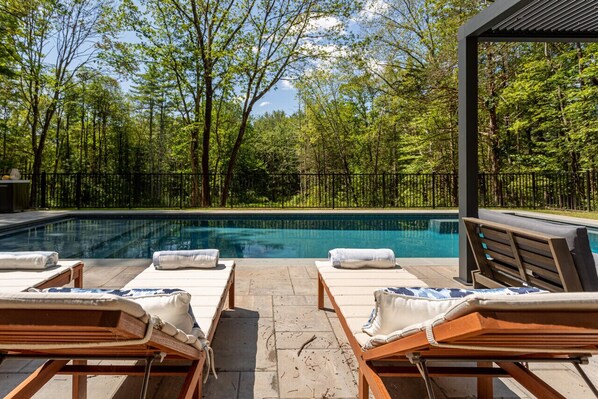 OUTDOOR FEATURES • Heated pool (16’ x 40’) with sun shelf (reopens June 2026) • Outdoor kitchen w/ sink, bbq, bev fridge • Hot tub (year round) • Dining area with seating for 6 • Bluestone patio covered seating area • Sun loungers • Pond with pet koi (no fishing, sorry) • Driveway parking for 6 vehicles