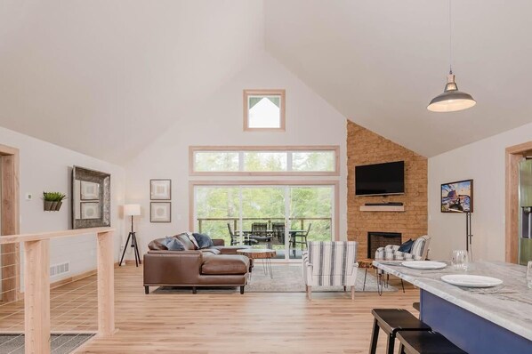 ▪︎Light-filled great room with a vaulted ceiling, cozy stone fireplace, and a smart TV.