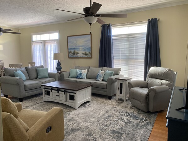 The open living area provides plenty of seating to include a sleeper couch, large dining table (seats 8), bar area (seats 2), 58" smart TV, games/puzzles and internet/Wi-Fi. A washer and dryer are available for your convenience.