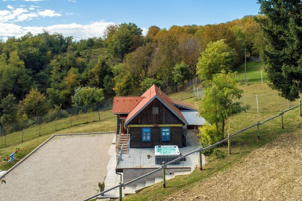 Forest home with jacuzzi, playground, and BBQ for family relaxation.