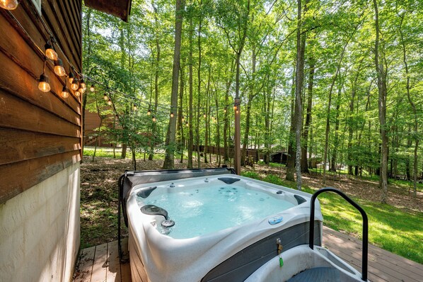 Escape to the tranquility of Deep Creek Lake at Get Your Creek On, where modern comfort meets rustic beauty. This charming cabin, nestled in the woods of the quaint Sky Valley community, offers an inviting open-concept living area with exposed beam vaulted ceilings, a crackling fireplace and a fully equipped kitchen for cooking and entertaining. Savor your morning coffee on the porch while listening to the gentle rustle of wildlife and the wind through the trees, immersing yourself in nature's symphony. Venture to the upper-level game area for some friendly competition with the foosball table, or step outside to the spacious deck, bubbling hot tub, and fire pit for ultimate relaxation and outdoor fun. You’ll enjoy community lake access where you can swim, kayak, or cast your line in the catch and release pond. Explore nearby attractions like Deep Creek Lake State Park and the four-season Wisp Resort for skiing and snowboarding in the winter, or golf in the spring and summer. Or simply soak up the natural beauty and foliage of the surrounding woodlands. Whether you're seeking adventure or serenity, Get Your Creek On provides the perfect year-round retreat for your Deep Creek Lake getaway.