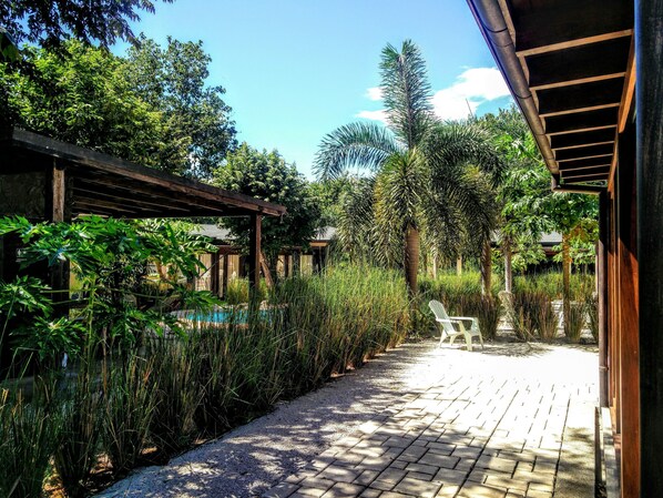 Beachwalk 5 is one of five Tropical 1000 square foot Villas nestled in nature in a gated small development in Avellanas. There is a SEASONAL jungle trail through the estuary to the beach during the dry months.