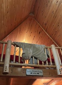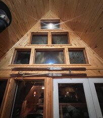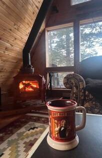 The attention to detail throughout the cabin was excellent. The old-school décor really stands out and reminds you of the history of skiing. My favorite feature was the fireplace—the red color with the black pipe gives it a unique and cozy feel.