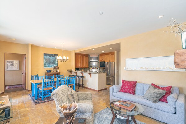 The balcony features outdoor seating and a gas grill, which help create the ultimate outdoor experience right in your own home. Oh, and the views! Soak it in any season. In the main living area, you will find ample cozy seating around a stone fireplace. The dining area is a part of the open space concept and features a pine wood/painted table with seating for eight guests. The kitchen is outfitted with high-end appliances, including a gas range and a farm style porcelain sink.