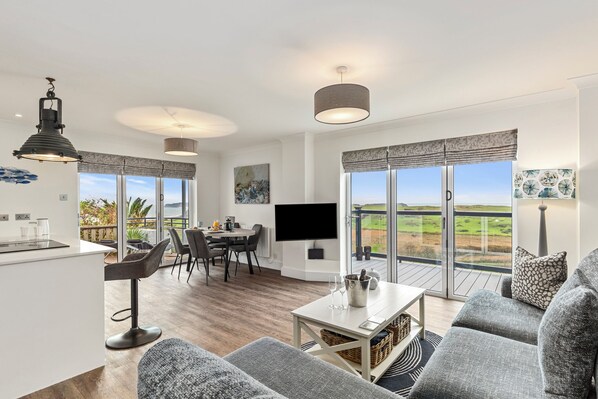 Living Room: Large corner sofa, flat screen TV, and dual sets of bi-fold doors – one opening onto a patio with loungers and seating, the other leading to a terrace with table, chairs and an egg chair for soaking up the sea views. A cloakroom/utility space provides storage for coats and shoes.