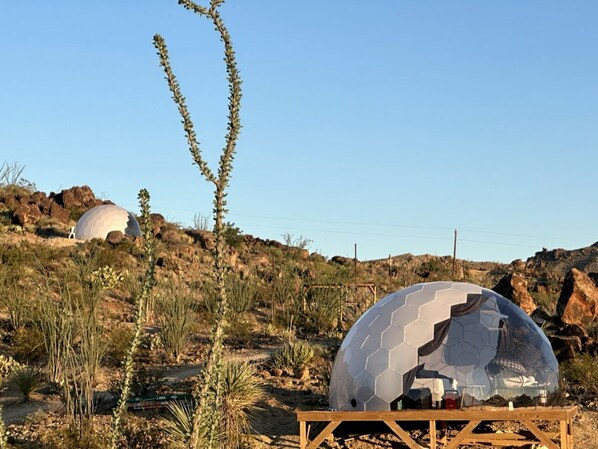 Trail Accessibility: Some trails leading to the further domes tent can extend a few hundred feet from the parking lot. Please be aware that our property may not be suitable for individuals with mobility issues or those unaccustomed to hiking. The terrain includes steep hills, uneven paths, and rocky areas, which may pose challenges for some guests. We want all our guests to have a safe and enjoyable experience, so please consider your physical abilities when booking your stay. If you have any concerns about accessibility, feel free to contact us, and we will do our best to assist you.Supervision and Safety: For the safety of all guests, we require adults to supervise children under 18 at all times. Children are not permitted to venture off-trail, lift or climb rocks, run, or enter restricted or construction areas. Additionally, both children and adults must use flashlights when walking around the property after dark. These guidelines are in place to ensure a safe and enjoyable experience for everyone. Thank you for your cooperation.Refund Policy: Guests have the flexibility to change their dates up to 1 month in advance at no additional charge. However, changes made within 1 month of the booking date will incur a $50 fee. Please note that by booking with us, you agree to our cancellation policy, which is outlined at the time of checkout. We appreciate your understanding and look forward to hosting you.Damage Policy: Any damage to the domes or facilities caused by guests will incur a fee. This includes but is not limited to, damage to furnishings, fixtures, appliances, and the property itself. Guests are responsible for any costs associated with repairs or replacements due to damage caused during their stay. We kindly ask all guests to treat our property with care and respect. Thank you for your understanding.Wildlife Awareness: The desert is home to various creatures, including spiders, wasps, snakes, scorpions, and other critters. While it may not be possible to keep all of these creatures at bay, properly closing the screen doors when you depart your dome or tent can significantly reduce their presence. Please be cautious of rattlesnakes; look before you step, and avoid moving or removing large rocks. We encourage exploration but prioritize safety above all else.Dark Sky Environment: As part of the Dark Sky Community, our property and its surroundings have minimal lighting. We have very few lights on our property for the same purpose. Always carry a flashlight when walking around after dark, and exercise caution to avoid any potential hazards. If possible, arrive before dark as it can be challenging to bring all your luggage up when it's dark. Respect for Desert Flora: Our property boasts a diverse array of cacti and desert plants. While these plants are beautiful, they can also be formidable, with many featuring sharp points or thorns. Please tread carefully and avoid stepping on any plants. Ocotillo cacti, in particular, can be quite large and sprawling, so be mindful of your surroundings. Please do not collect rocks or plants.Terrain Caution: As you ascend the hill, be mindful of the terrain. Off-trail areas consist of crumbly and sharp volcanic rock, making it unsafe to venture off the designated paths. Always stay on the trail, especially when going uphill or downhill. We recommend wearing sturdy hiking shoes for your safety.Emergency Preparedness: The nearest hospital is located in Alpine, which is over an hour away. Please keep this in mind and take necessary precautions during your stay.Power and Water Usage: While we strive to provide a comfortable experience, power outages can occur. We have portable generators and power banks for such occasions. Please use the air conditioning units responsibly, turning them off when not needed. Our water supply is limited, so we kindly request that showers be kept to 3-5 minutes maximum.Respectful Behavior: While we do not have set quiet hours, we expect all guests to be considerate and respectful towards one another. Failure to adhere to this simple rule may result in being asked to leave.Communication and Expectations: Your comfort and enjoyment are our top priorities. We aim to respond promptly to your needs and requests. However, please understand that we may be attending to other guests or temporarily out of cell service range. For non-emergencies, please message us through the app or text us.Leave No Trace: Please adhere to the national Leave No Trace rules. Trash facilities in the immediate area are limited, so please dispose of waste responsibly.Amenities Provided: We provide clean white linens, extra blankets, shampoo, body wash, conditioner, soap, white towels, a heater (requires a small 1lb propane tank), fan, fridge (Space Pods), lights, nebula laser, household plugs, indoor and outdoor furniture, and a fire pit for your convenience. Respect for Others: We expect all guests to treat each other and our staff with respect. Unruly behavior, including excessive noise, disturbance of other guests, or disrespectful conduct towards staff, will not be tolerated. Guests who do not adhere to these guidelines may be asked to leave the property and may not be eligible for a refund. We strive to maintain a peaceful and enjoyable environment for all our guests, and your cooperation is greatly appreciated.