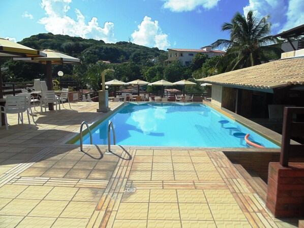O local oferece piscina externa e piscina infantil.