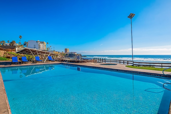 Dog-friendly suite with beach views, outdoor pool, patio, kitchenette, & AC