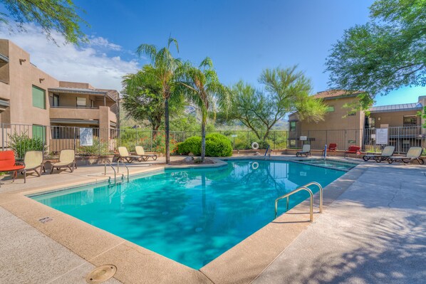 Later, sit on the patio with a glass of wine or a warm cup of coffee and enjoy the clear blue skies and spectacular mountain views. You might even see a humming bird buzzing by. Go for a refreshing dip in one of the three pools in the complex. One pool is just steps from the condo. Or, go to the workout facility and then enjoy a bubbling soak in the spa.