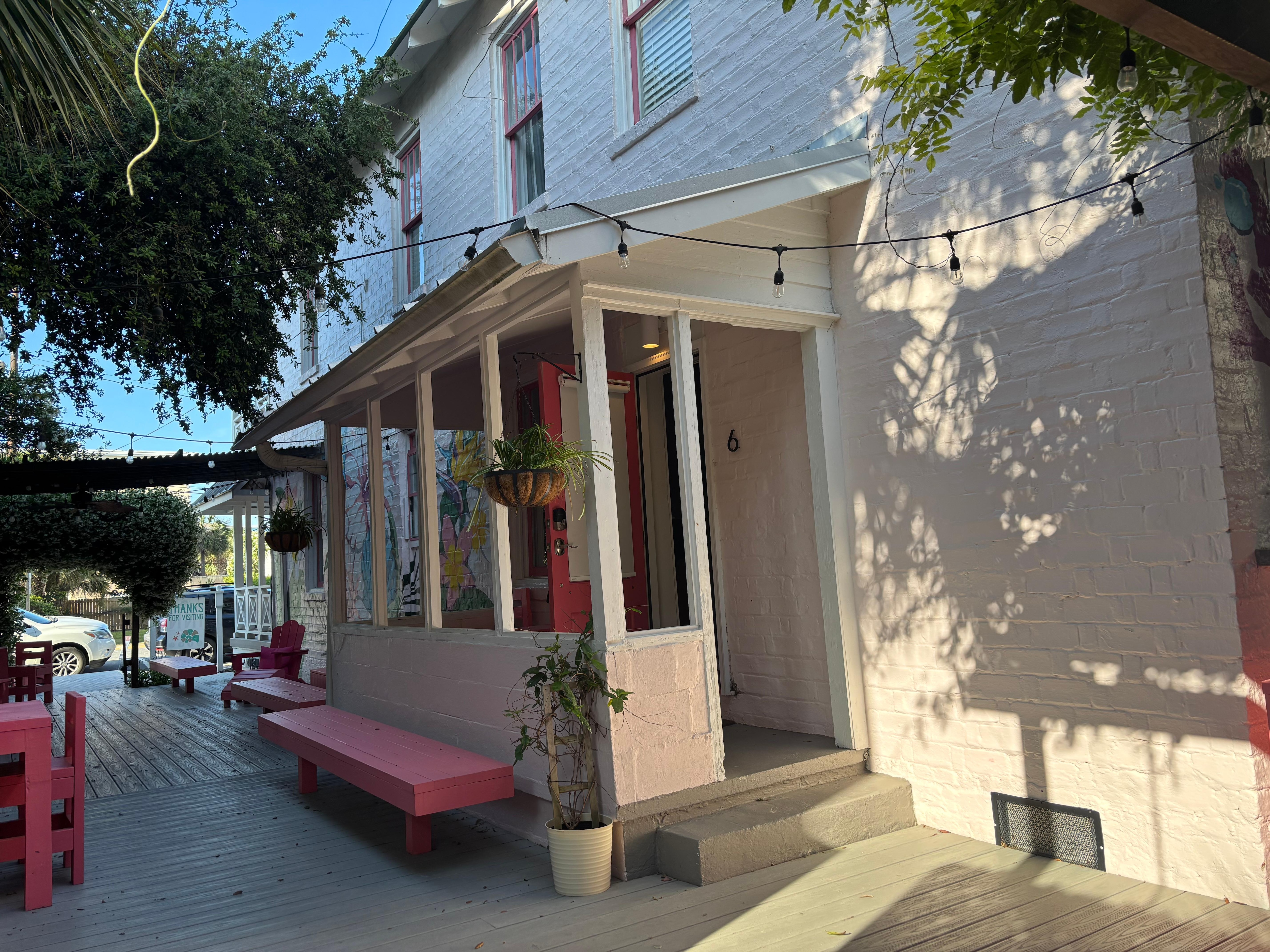 Cool 1st Floor 1BR/1BA Studio Style Condo w/ Kitchenette on Tybee's South End - just 400 feet to the beach in an updated Historic Inn!! Beautiful cool outdoor seating area shared by all guests including outdoor showers to rinse off from a day at the beach. You have your own private deck off the room, it's perfect to have a cocktail on & unwind, and enjoy free streaming your favorite Netflix & Hulu accounts!