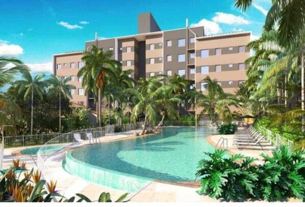 Este apartamento para famílias tem uma piscina externa e uma academia