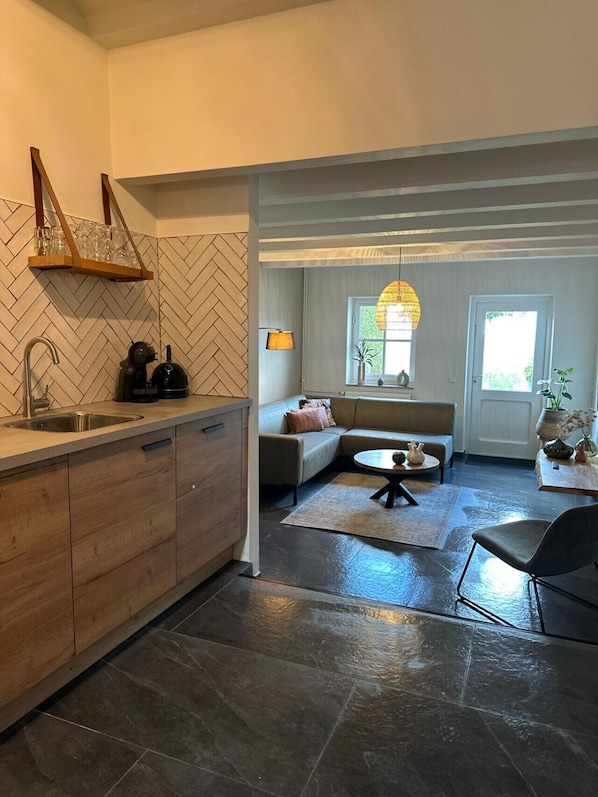 De living grenst direct aan het buitenterras met weids uitzicht over de grote weide die tot het complex behoort en op het Limburgse landschap. Daar is heerlijk genieten van een etentje en een drankje. Ben je met kinderen, dan kunnen die naar hartelust spelen in de weide en kun je ze toch in de gaten houden.