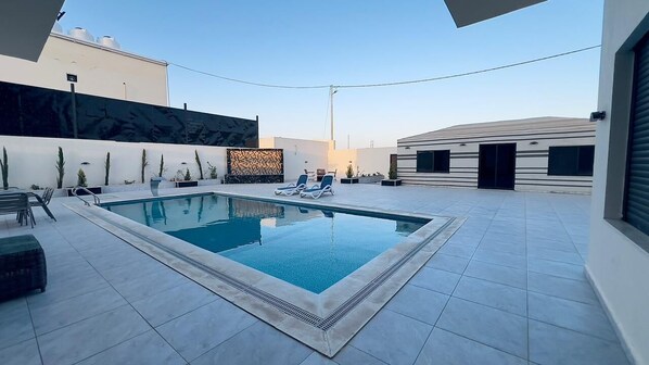 Este chalé em Wadi Rum tem piscina interna e piscina externa.