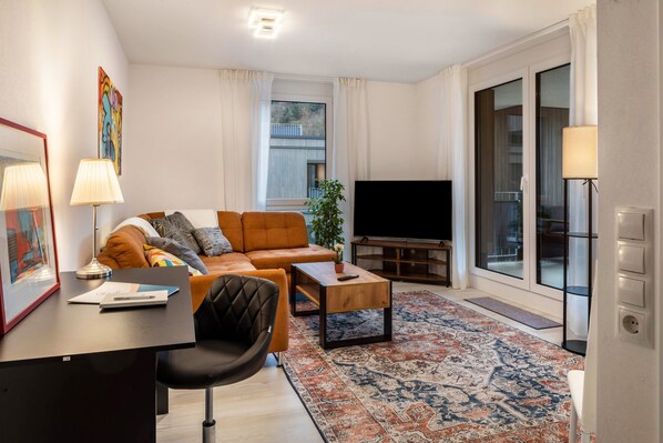 The holiday apartment Felsenkeller Appartement 16 with step-free access and interior, which is situated in Waldkirch, overlooks the nearby mountain. The 55 m² property consists of a living room with a sofa bed for 2 people, a well-equipped kitchen, 1 bedroom and 1 bathroom and can therefore accommodate 4 people. Additional amenities include high-speed Wi-Fi (suitable for video calls) with a dedicated workspace for home office, a smart TV with streaming services as well as a washing machine. The building in which the accommodation is located has an elevator. This vacation rental features a private outdoor space with a covered terrace and balcony.