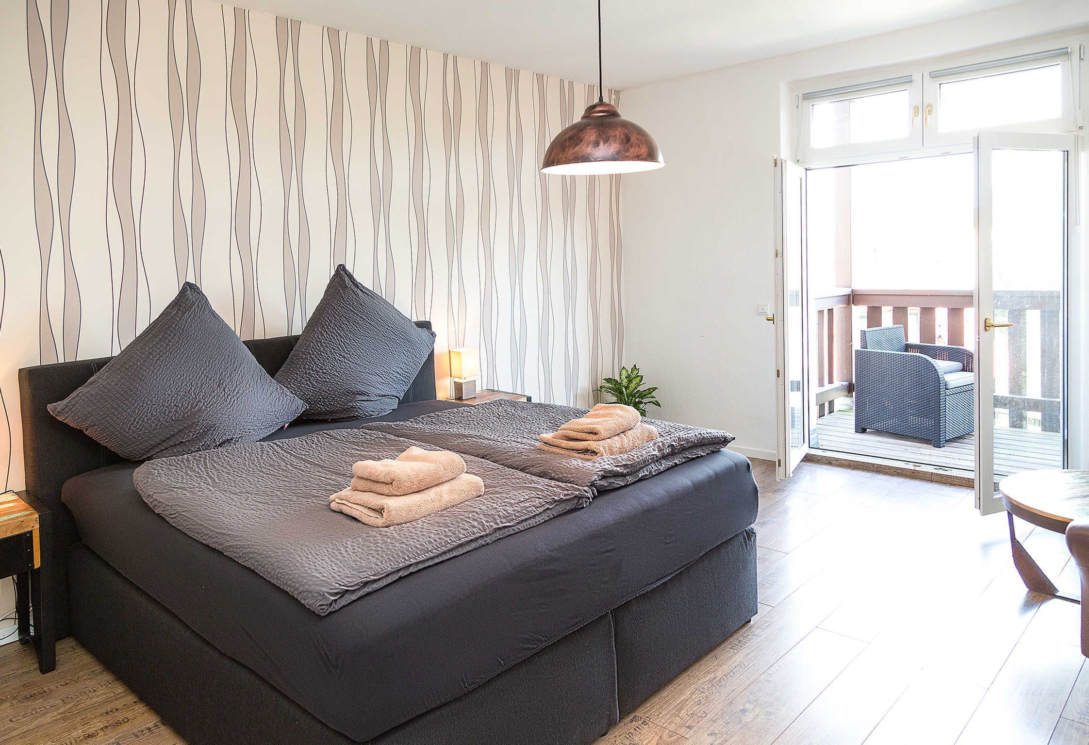 The Ferienwohnung am Kölpinsee is furnished in a Mediterranean style. The apartment is located on the ground floor and offers a private terrace with lake view and direct lake access. The blaube basket table and chairs and furniture in light beech and matching curtains and pleasing decorations give the apartment an atmosphere where you will feel at home. The kitchen is fully equipped. In the living area there is a TV. The two additional single beds are located in the passageway between the kitchen and the living room. Throughout the Holiday Terracotta Nasty are laid.