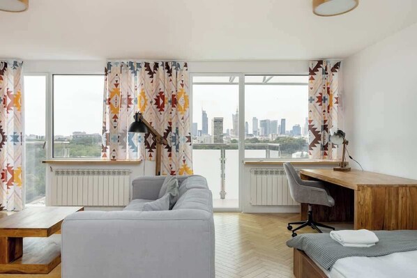 A spacious studio apartment of 35 m2, featuring a room with a comfortable double bed, a fully equipped kitchenette and a bathroom with a bathtub. The studio has large windows through which you can enjoy, breathtaking, view of the panorama of Warsaw from the 15th floor. The windows are directed towards the centre, thanks to which the Palace of Culture and Science, as well as the modern skyscrapers in the city centre, are clearly visible. The studio's interior filled with warm colours and wooden accents guarantees a pleasant atmosphere and a pleasant stay. It is an ideal choice for couples wishing to visit the capital, as well as for solo business travellers. The studio is suitable for remote work, as it has a desk with a chair and access to a wireless WIFI network. Our guests can also relax in front of the TV with cable channels and Smart TV function. All amenities such as a hairdryer, oven with microwave function, kettle, toaster and iron are available. Fresh linen for each of our guests, towels, toiletries for the bathroom, as well as coffee and tea making facilities are provided.