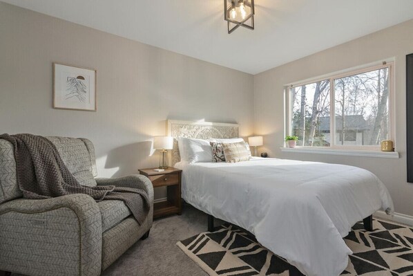 On the other end of the house, you`ll find the second and third bedroom, both equipped with queen beds, local art, and charging ports. The second bath has a tub and shower combo and is also supplied with shampoo, conditioner, body wash, hand soap, and locally made Alaskan lotion.