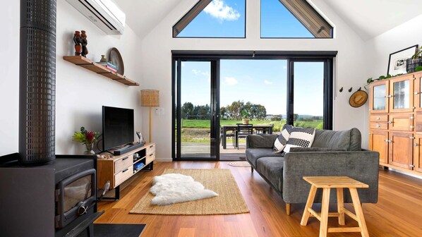 Our open-planned space invites you to unwind in style. Inside, a fully equipped kitchen awaits, complete with a dishwasher, stovetop, oven, and fridge – perfect for cooking up fresh, local ingredients. The cozy Queen bed comes with ample storage for your clothes, while the dining and lounge area provides an ideal setting to share a meal or curl up with a good book.