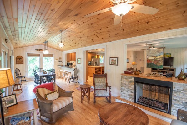 Once you tear yourself away from the scenery and come inside, you'll find a luxurious, well-appointed home environment, with large seating areas and comfortable furniture. The main level features an open floorplan, with a large living room, fireplace and TV. You'll love the huge modern kitchen with island, stainless appliances and everything you'll need for meals and entertainment. In addition, the main level includes a dining room, sitting room with fireplace, the master suite with its en suite updated bathroom, as well as another full bath, also equipped with a walk-in shower.