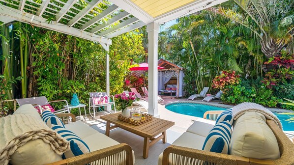 Step outside to your private tropical oasis, designed for ultimate relaxation and entertainment. Whether you're enjoying a quiet morning or hosting a sunset gathering, this space has it all: