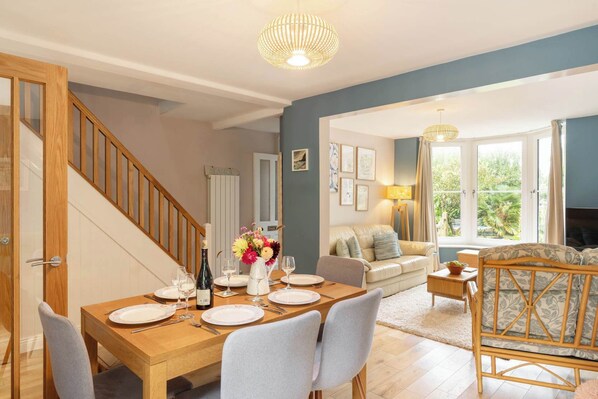 The living room is a comfortable space featuring two large sofas, a bay window, and a flat screen TV with Freeview channels and streaming apps. This is the ideal space for relaxing evenings with your loved ones. Sharing the living space is a cosy dining area with a modern wooden table with grey fabric chairs and wooden bench.