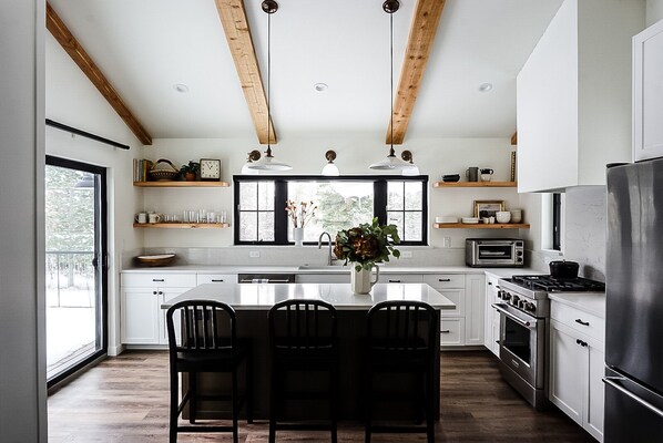 Esta casa de campo em Whitefish dispõe de cozinha e lareira