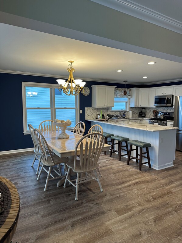 The kitchen table has 6 chairs, and the kitchen island has 4 stools. The kitchen is fully equipped with service for 10, a blender, toaster, drip coffee maker and all needed pots, pans, and utensils for cooking.