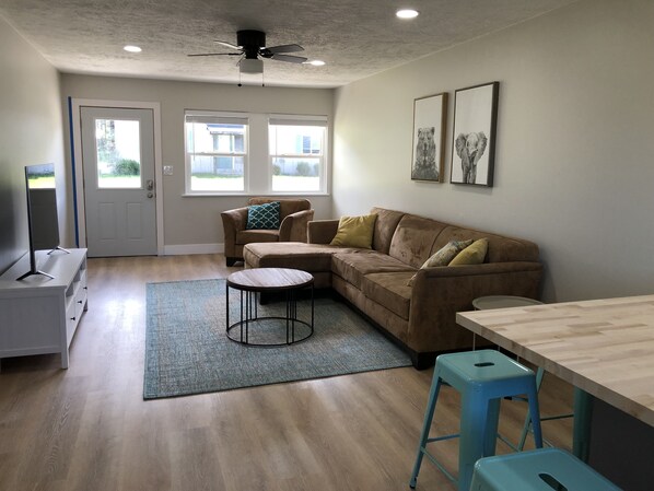 This is a Duplex where the units join via the garage. There is no dividing wall in the garage, so you will share that space with the other unit. Interior walls are divided by the laundry rooms. The space comfortably accommodates four people, but can accommodate five if there is a child (couch- wich is NOT a pull-out)). Renovation includes all new exterior siding, windows and doors. Interior has all new Luxury Vinyl Plank flooring throughout, windows, doors, and fresh paint. Kitchen has new cabinets, sink, butcher block countertops along with updated appliances. Bathroom has new vanity, toilet and shower.