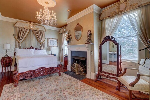 Our guests say this is a hidden gem in historic downtown Wilmington! This one-bedroom suite features a private bath, kitchen and temporary membership to Wilmington's exclusive City Club. Enjoy a comfortable living room complete with desk, sofa and Roku TV. Sleep in the luxury QUEEN bed and relax in the large jacuzzi tub or stand-up shower. Please note that the fireplaces are not functional, as they are many years old and just not safe. We hope to have them back for winter 2025. Also, we no longer provide parking with the stay. There are numerous paid and free parking spaces in the downtown area. The Inn at City Club is within walking distance of many other fine and casual dining restaurants, coffee shops, nightclubs and local theaters.