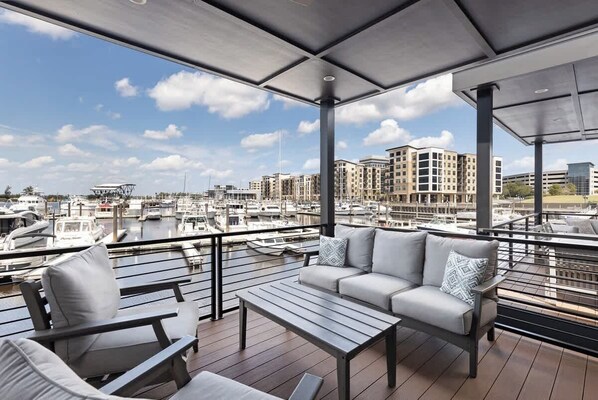 Large patio on second floor featuring an outdoor bar with a mini fridge and sink and a variety of comfortable furniture options. This patio is a fan favorite for everything from morning coffee, afternoon reading, evening spirits, or enjoying a meal.