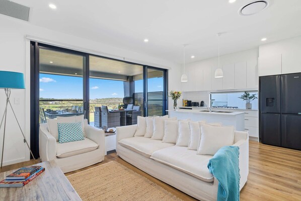 The open-plan living area is bathed in natural light. With the inside/ outside living space and large open doors to the private balcony, seamlessly connecting to a large covered balcony with BBQ. Enjoy alfresco dining or relaxing in the outdoor lounge area offering sweeping 180 degree views of the renowned Links Golf Course. This is the perfect spot to enjoy your morning coffee from the Nespresso machine, lunch, BBQ with friends or family or a quiet evening with the stunning landscape as your backdrop.