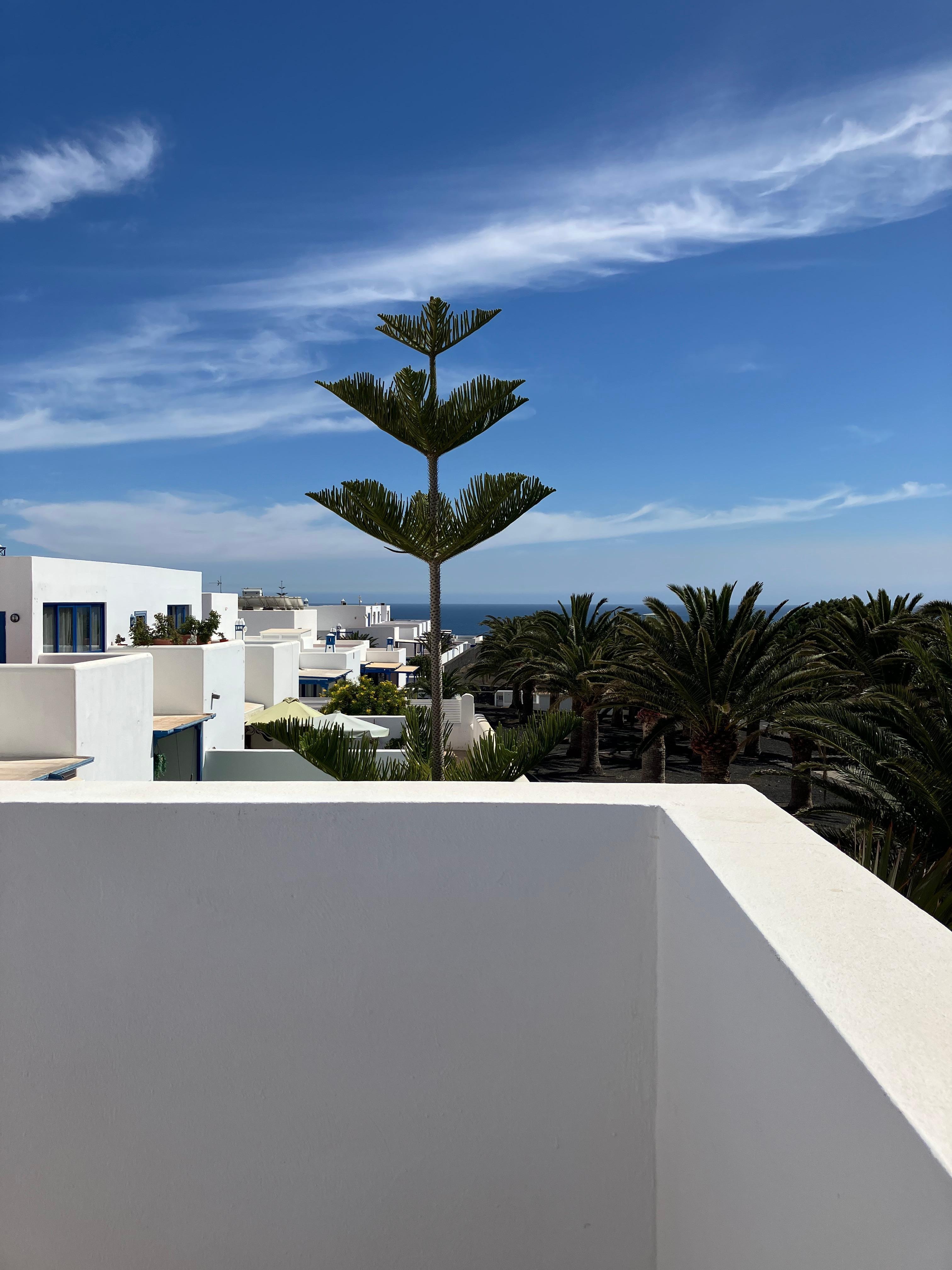Beautiful property with outstanding views from the roof terrace were you can lounge on the corner suite or sunbeds and take in the beautiful sunrise/sunset. You can see the sea from one side and the volcanoes from the other. The property is not overlooked and allows you to relax/sunbathe in private. The pools are beautiful and mainly peaceful. We find Puerto Calero peaceful and relaxing but there are restaurants galore and a couple of bars.